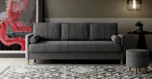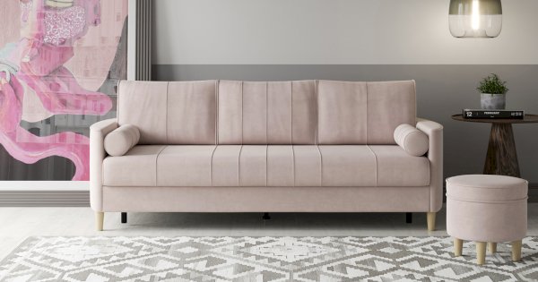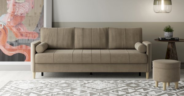 Комплект состоит из прямого и углового диванов, кресла для отдыха и пуфа.