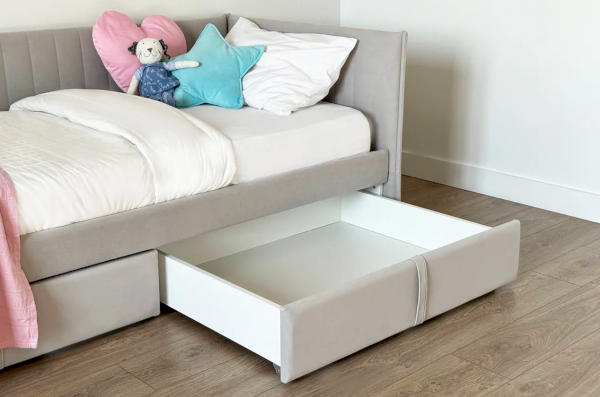 Уникальной особенностью модели являются удобные выкатные ящики, которые идеально подходят для хранения игрушек и постельного белья. Ящики обеспечивают легкий доступ к содержимому благодаря надежным роликам, что позволяет быстро и удобно организовать порядок в комнате.