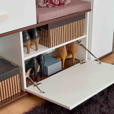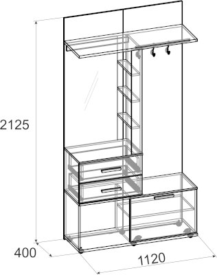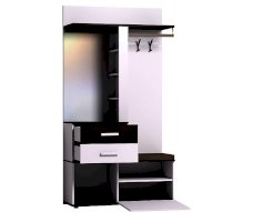 Многофункциональный шкаф Норвуд 70 - находка для маленькой прихожей. В небольшом по габаритам модуле (шириной 1120 мм и глубиной 400 мм) сочетается всё необходимое для обеспечения функциональности прихожей: крючки, стационарная штанга, открытые полки, выдвижные ящики, отделение за откидным фасадом, открытая ниша, зеркало с подсветкой. Встроенная светодиодная подсветка включается при помощи аккуратного кнопочного выключателя. Откидной фасад дополнительно фиксируется при закрывании магнитной защелкой. Горизонтальные детали толщиной 22 мм и фасад верхнего ящика из теплого темного ЛДСП в декоре Орех Шоколадный играют на контрасте с белым декором модуля. В комплектацию входит мягкое сидение, которое позволяет обуваться с комфортом. Регулируемые опоры помогают компенсировать неровности пола в прихожей. Собрать Шкаф МЦН можно как на правую, так и на левую сторону.