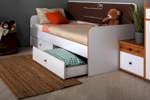 - Кровать укомплектована основанием-настилом. Плоское сплошное основание представляет собой поверхность, изготовленную из строганных досок, фанеры или ДСП (изготавливается из прессованных древесных стружек). Обрабатывается защитными и декоративными средствами, крепится к каркасу. Сплошное основание тяжелее, чем ортопедическое, менее мобильное. Сплошная конструкция пригодна для эксплуатации в комплекте с любыми типами матраса, хотя ортопедические изделия в таком случае частично теряют свои анатомические свойства.