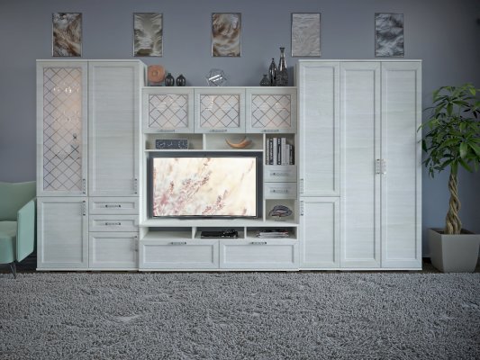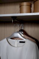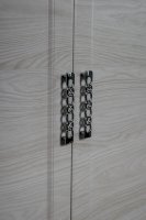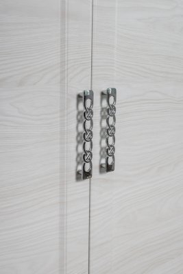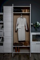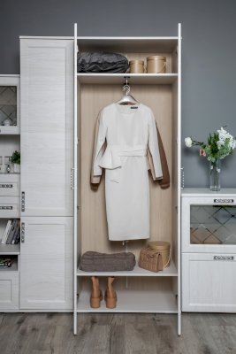 Элегантный двухстворчатый шкаф будет прекрасно смотреться в интерьере. Функциональность данной модели заслуживает внимания: внутри две вместительные полки и выдвижная штанга. Не остается незамеченной и изящная форма ручек – она придает шкафу дополнительный шарм.