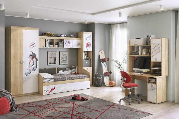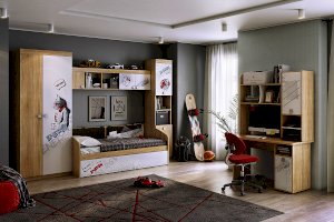 Замечательный вариант для подростка. В 2-створчатом шкафу «Энерджи» есть 2 штанги для одежды и полки для белья. Полноценный гардероб из серии «Энерджи»! Эффектный принтерный рисунок на фасадах выдержан в общем стилистическом решении. Рисунок устойчив к истиранию и ультрафиолету.